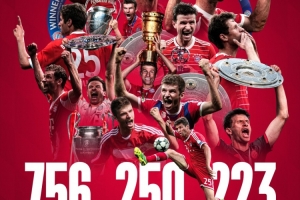 拜仁社媒致敬穆勒:拜仁生涯756场250球223助,33座冠军奖杯